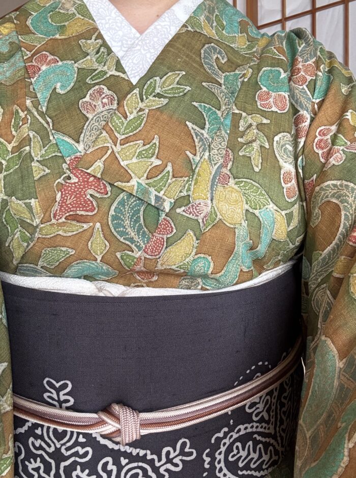 ふだん無地感のきものを着ることが多いせいか、夫から「今日はずいぶんおしゃれしてるね」と言われました。紅葉の季節やクリスマスに着たくなる紬です。帯はわたしデザインの型染め名古屋帯「グランブーケ」。花束を包むレースの紙をイメージしています。着ているきものや着ている人が花になる帯です。(この帯については、きくちいまオリジナル製作委員会のお店にお問い合わせください)